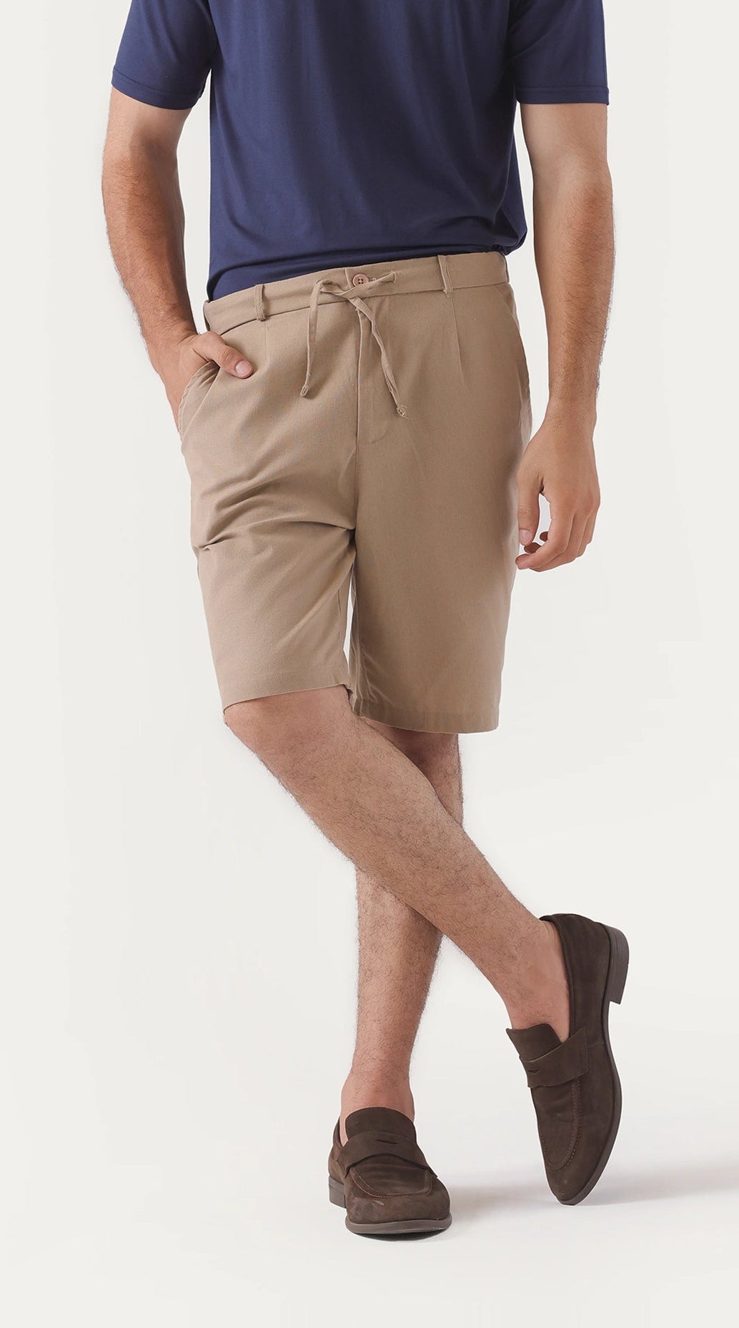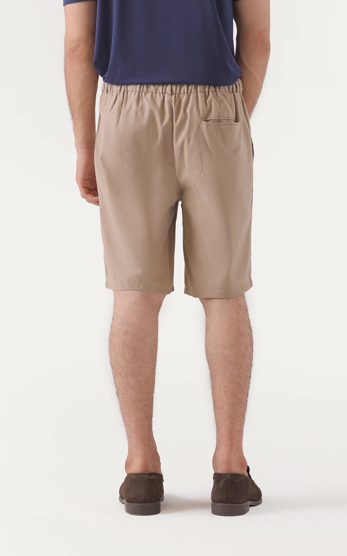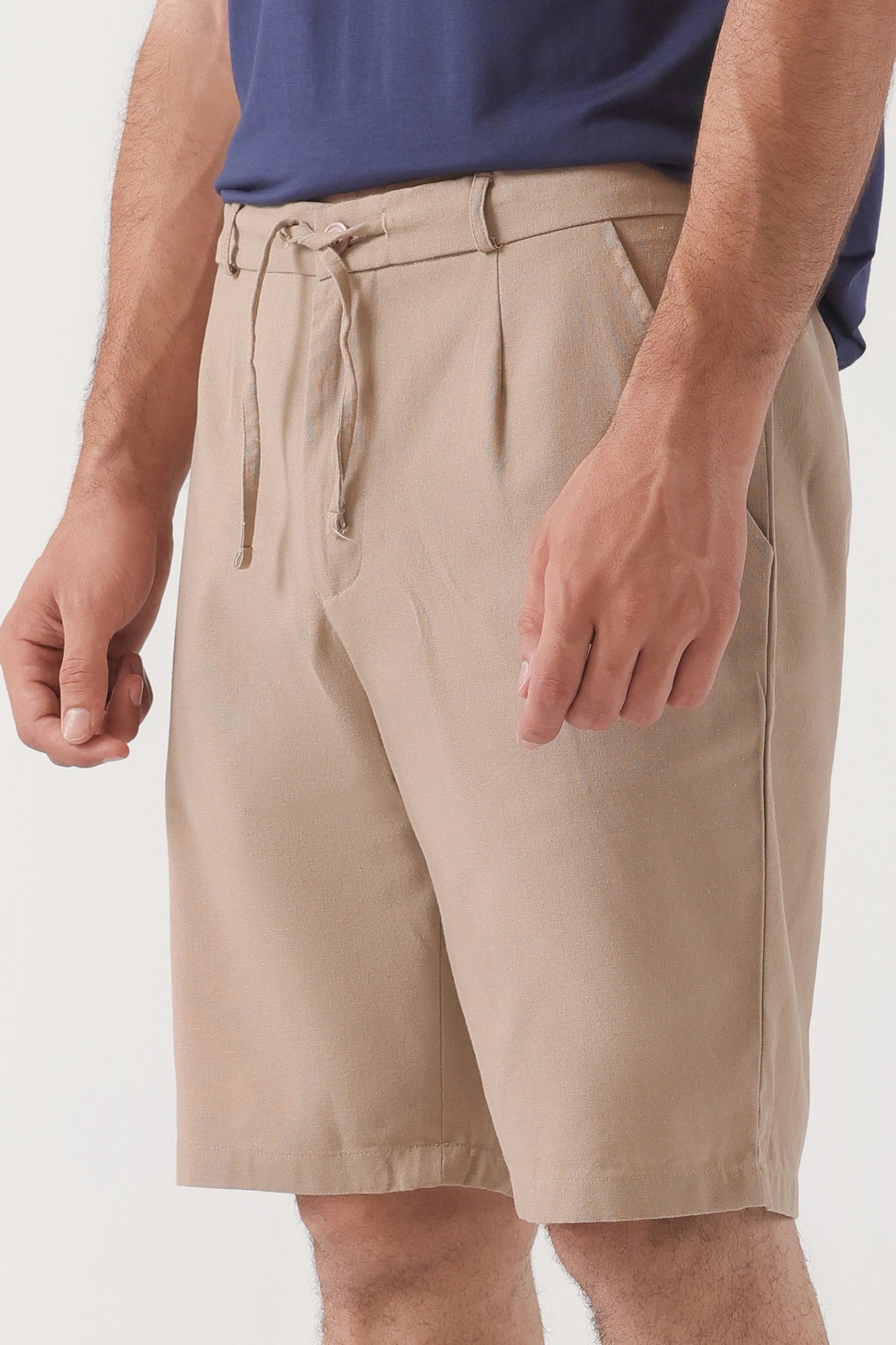 These beige linen shorts blend contemporary style with casual refinement, crafted from a breathable linen-cotton blend for comfort and durability. Featuring a drawstring waist for a customizable fit, plus side slanted and rear pockets that enhance both functionality and design. Their structured silhouette delivers a sophisticated yet practical option for warm-weather dressing.