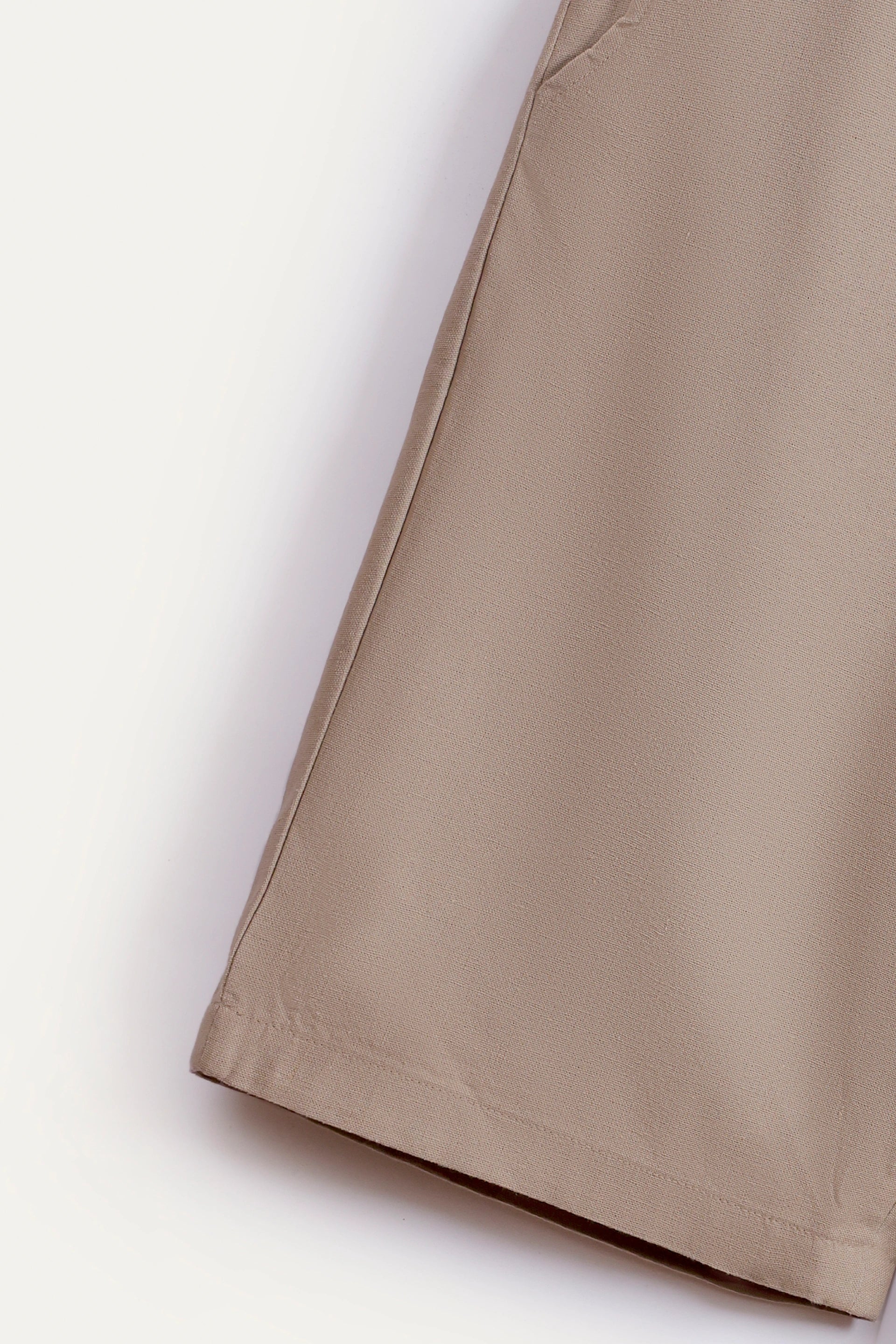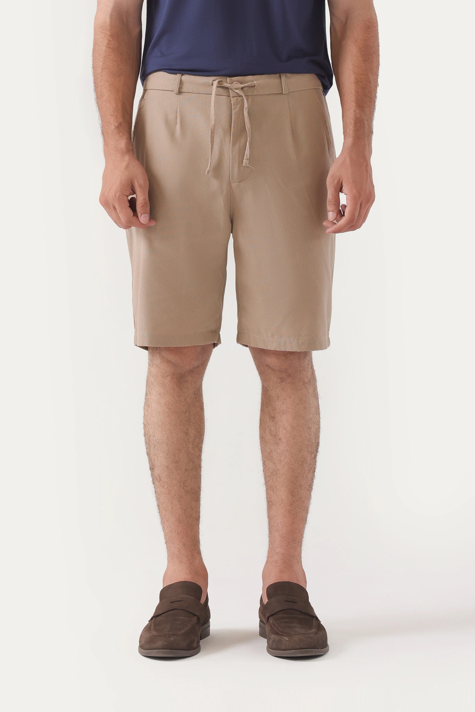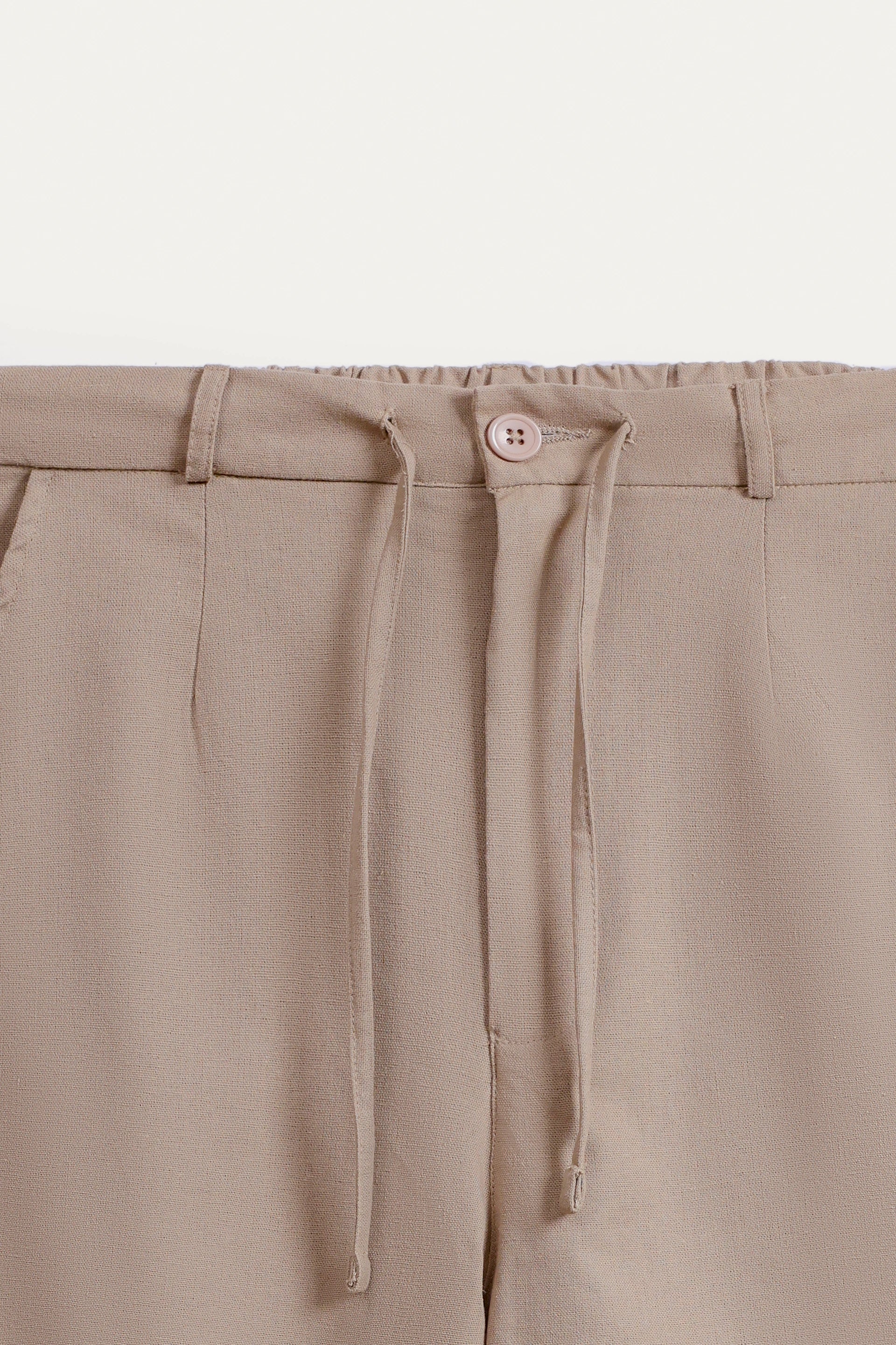 These beige linen shorts blend contemporary style with casual refinement, crafted from a breathable linen-cotton blend for comfort and durability. Featuring a drawstring waist for a customizable fit, plus side slanted and rear pockets that enhance both functionality and design. Their structured silhouette delivers a sophisticated yet practical option for warm-weather dressing.