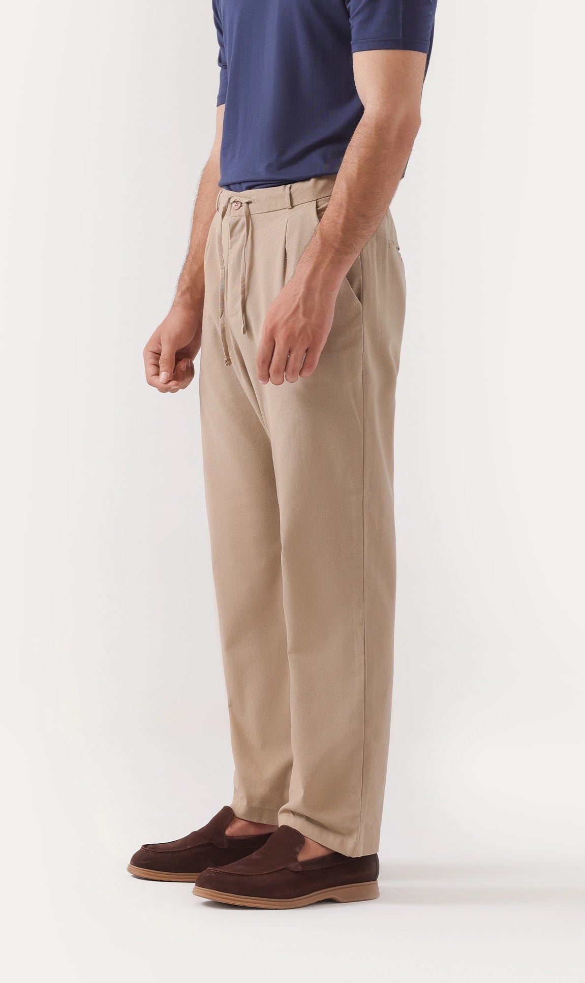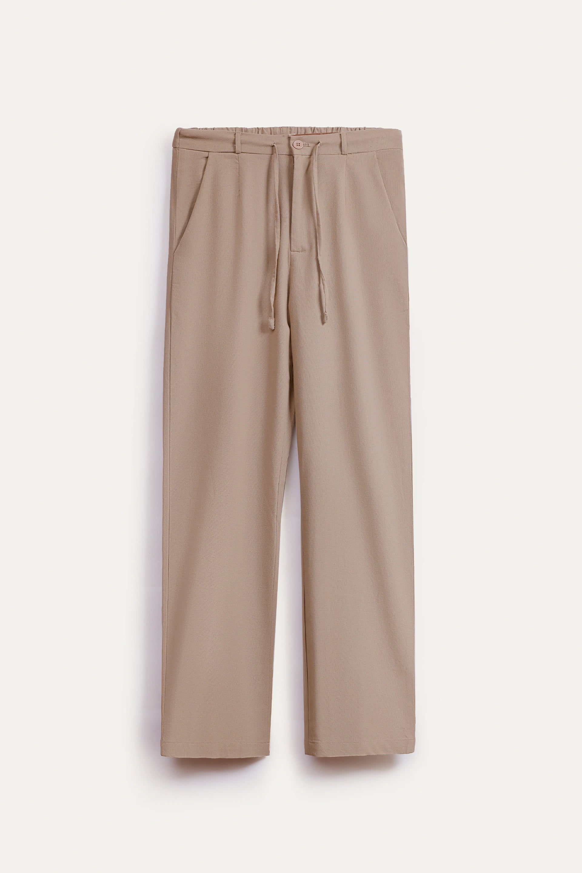 Experience comfort and style with these beige linen trousers, crafted from a breathable blend of linen and cotton. Designed with a drawstring waist for a customizable fit, they provide ease throughout your day. Functional side slanted and rear pockets add practicality without sacrificing the sleek, structured look. Perfectly combining subtle sophistication with everyday utility, these trousers support your casual elegance effortlessly.