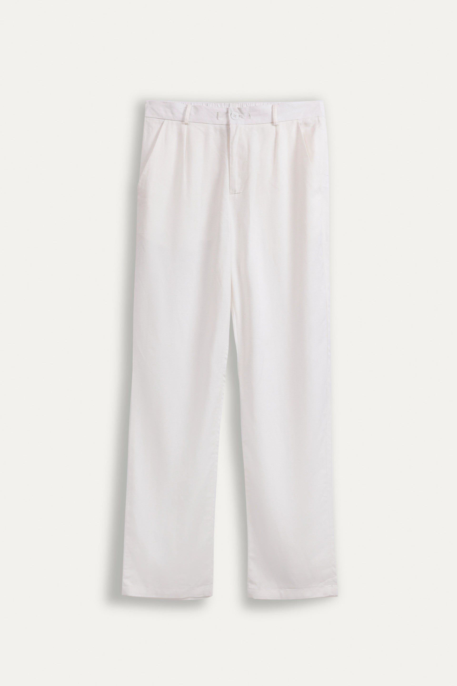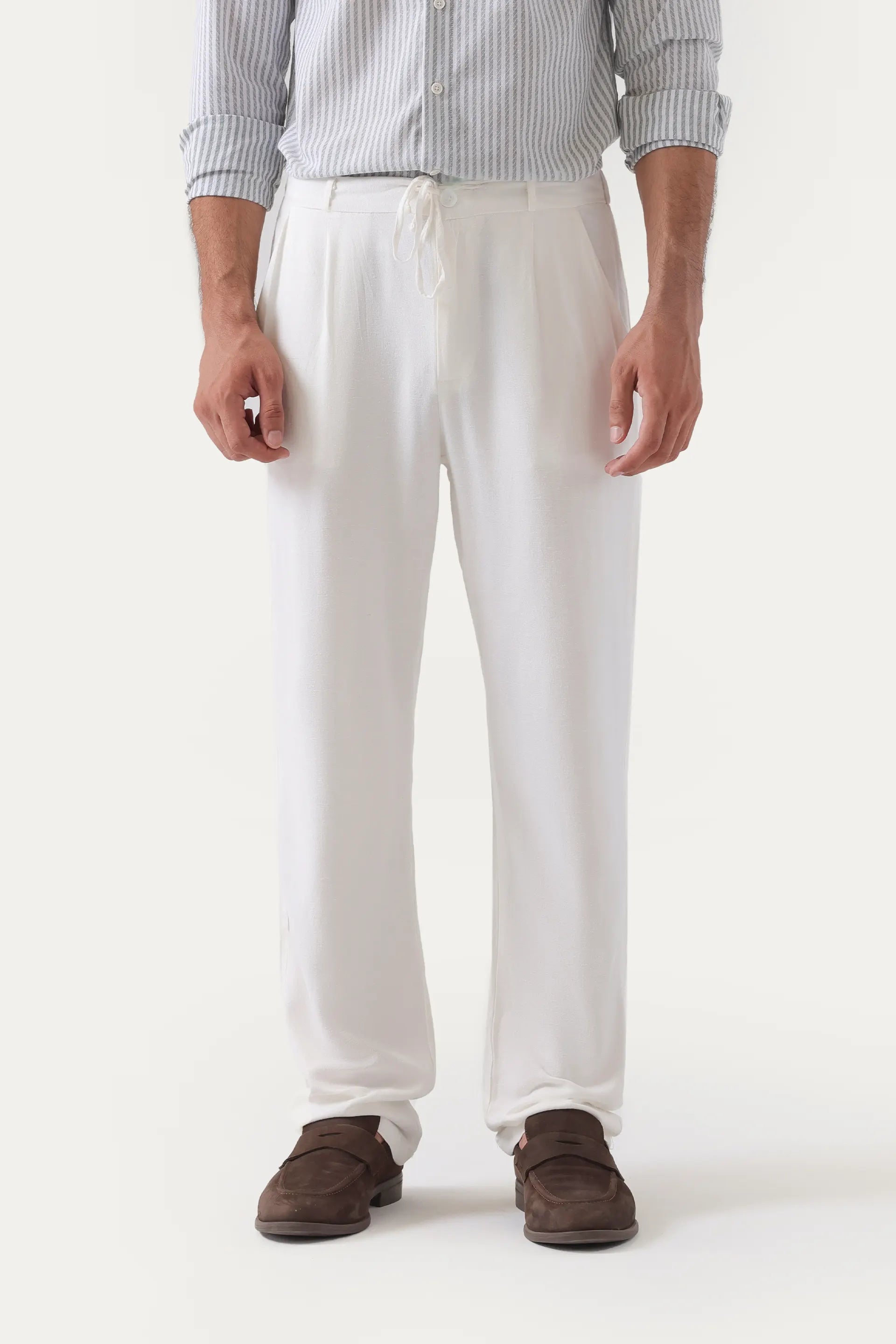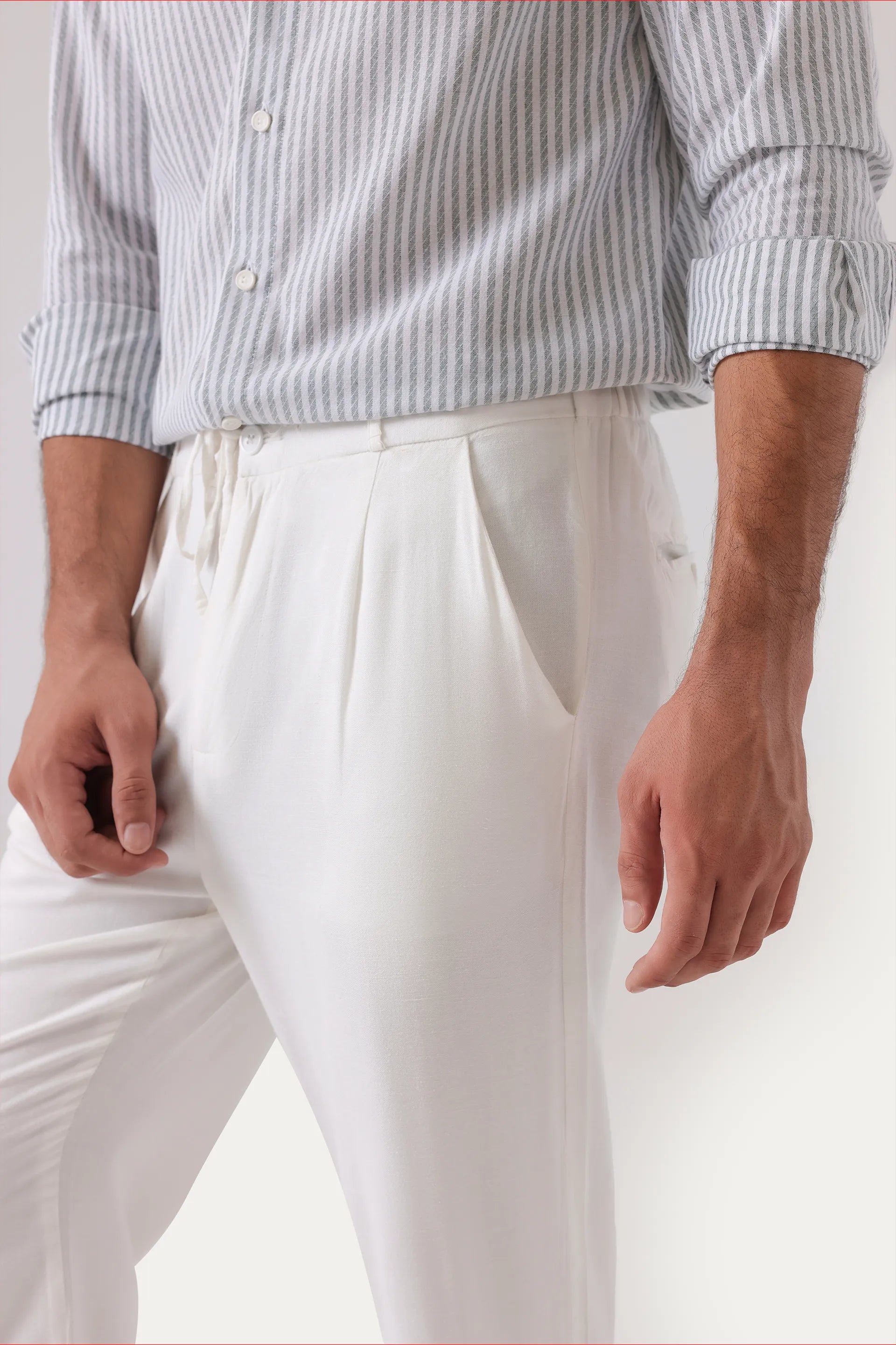 Elevate your wardrobe with these white linen trousers that embody casual elegance through a refined blend of breathable linen and cotton. Designed with a drawstring waist for personalized comfort and complemented by side slanted and rear pockets, they seamlessly combine practicality with understated sophistication. Perfect for those seeking a stylish yet functional addition to their collection.