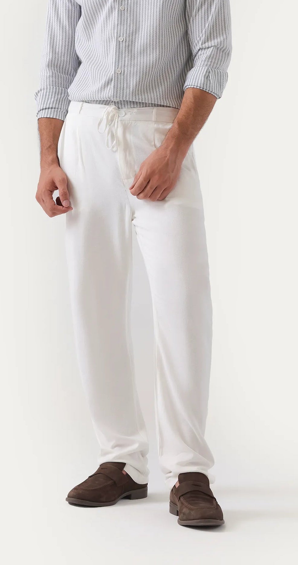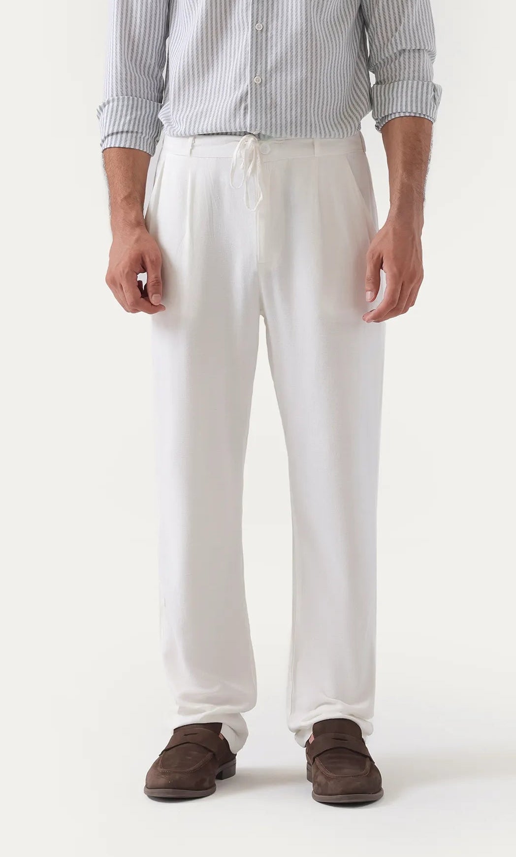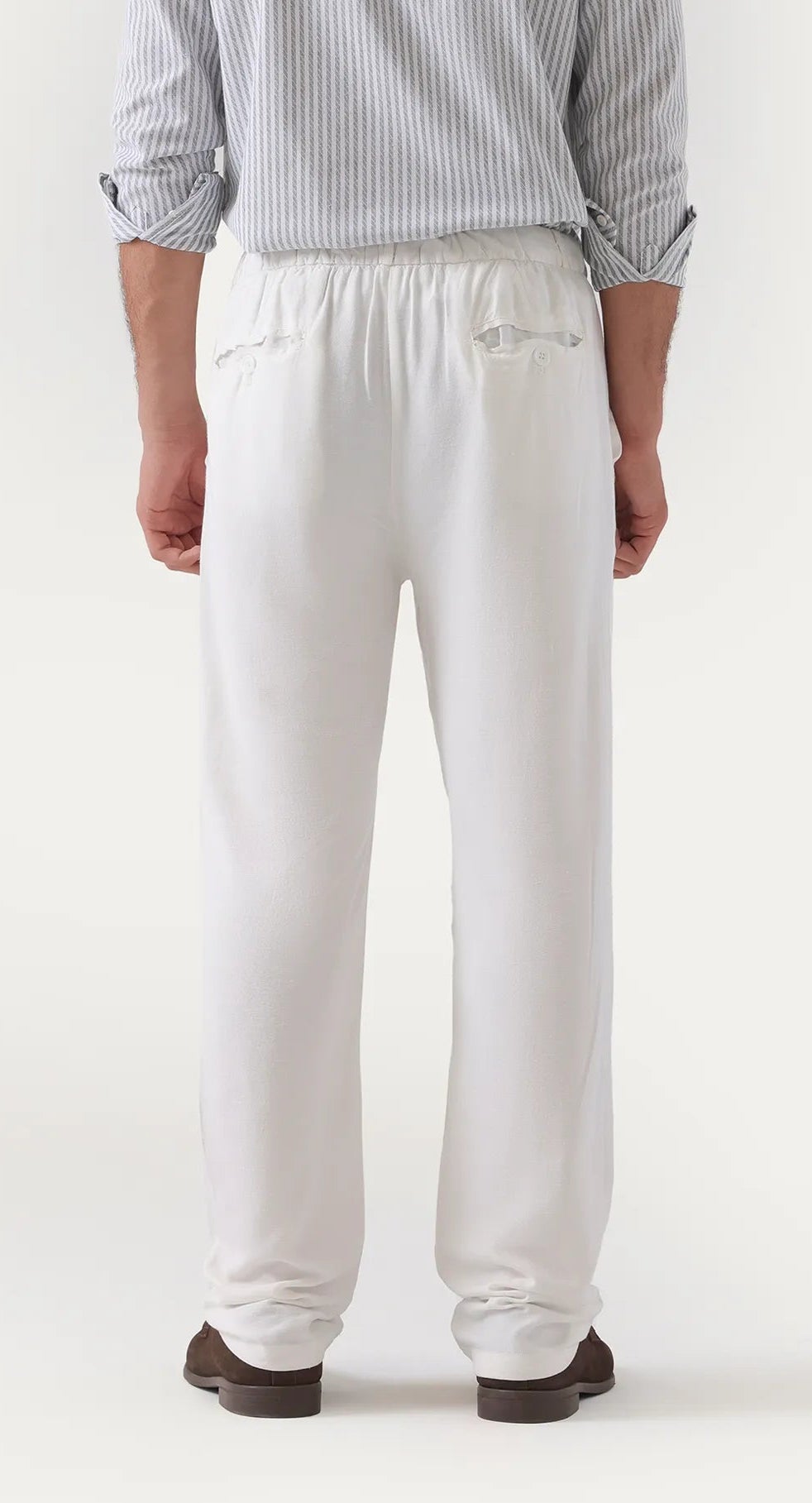 Elevate your wardrobe with these white linen trousers that embody casual elegance through a refined blend of breathable linen and cotton. Designed with a drawstring waist for personalized comfort and complemented by side slanted and rear pockets, they seamlessly combine practicality with understated sophistication. Perfect for those seeking a stylish yet functional addition to their collection.